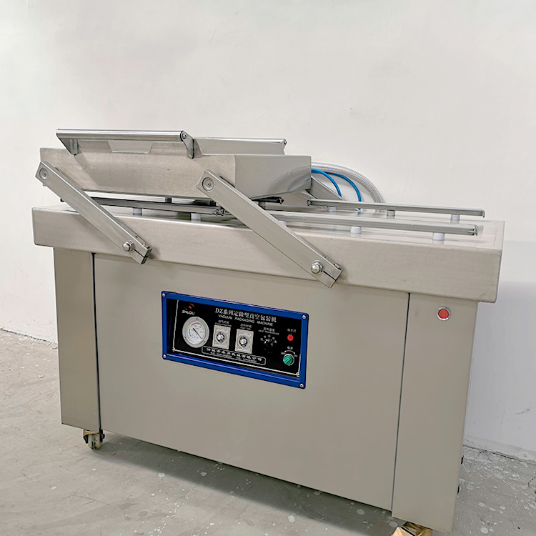 以500型號真空包裝機為例,真空包裝機封口尺寸為500毫米,中心距420毫米,一共有兩個真空室,每個真空室有兩根封口條,該機型操作過程簡單,先插上電源插頭,打開電源開關后,再在控制面板上設定參數,待抽氣、加熱、封口時間設定好,將包裝物品放置在封口線上。放好后,按下真空蓋自動開始工作,帶真空表回零后即工作完成。一般情況下配置2個20泵,或者一個40泵,用戶可根據自身產品選擇。